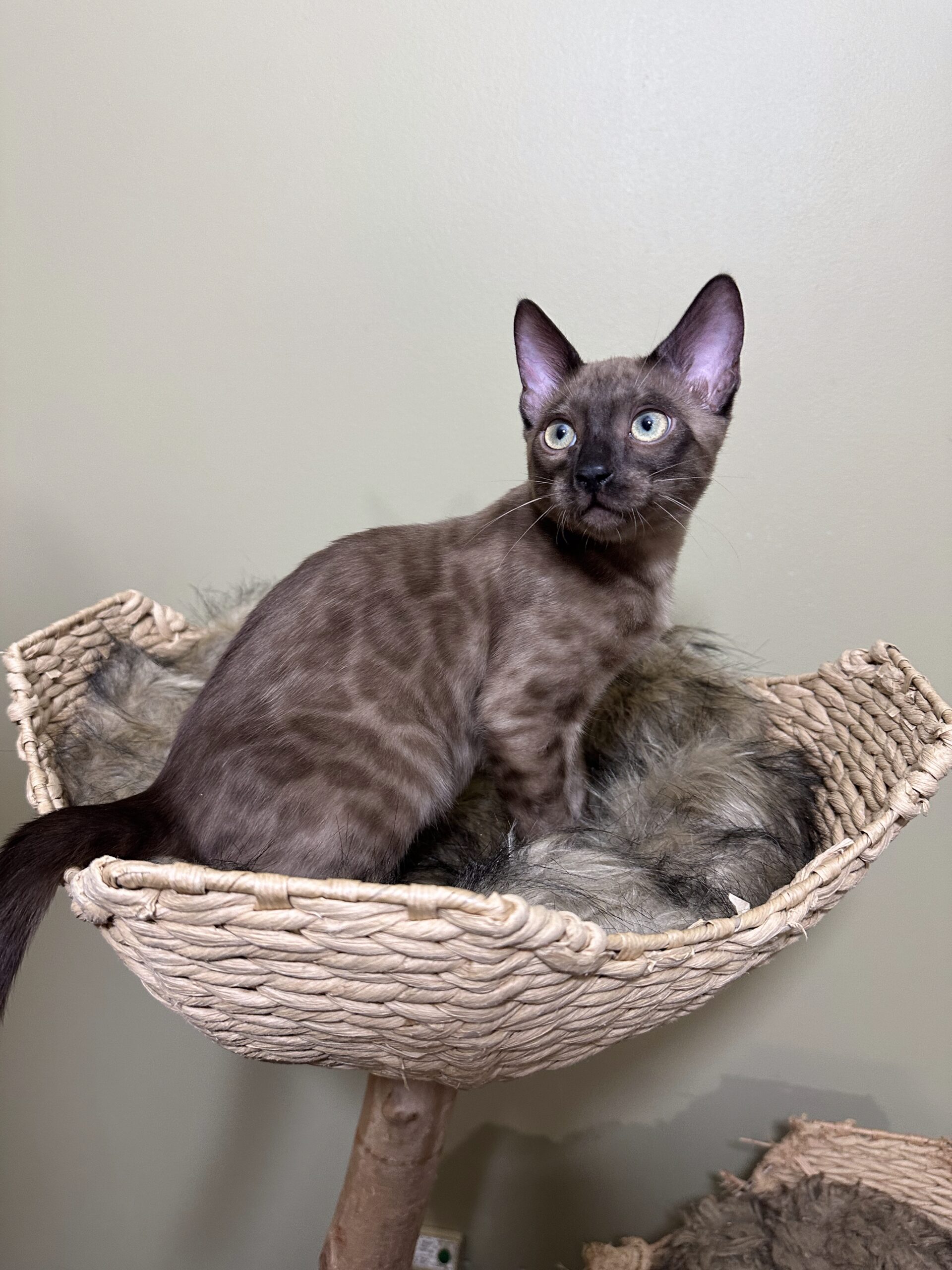 Son to our Italian Stud, Leone and Frances Bean from the UK, born 6/8/2025 here at Eastward Gardens Bengals. He was the unicorn of the litter, a Smoke Mink, and we knew from the moment he was born he was special! We are hoping to breed him in 2026 with a new female from Kentucky Wildcat Bengals …stay tuned for more details!