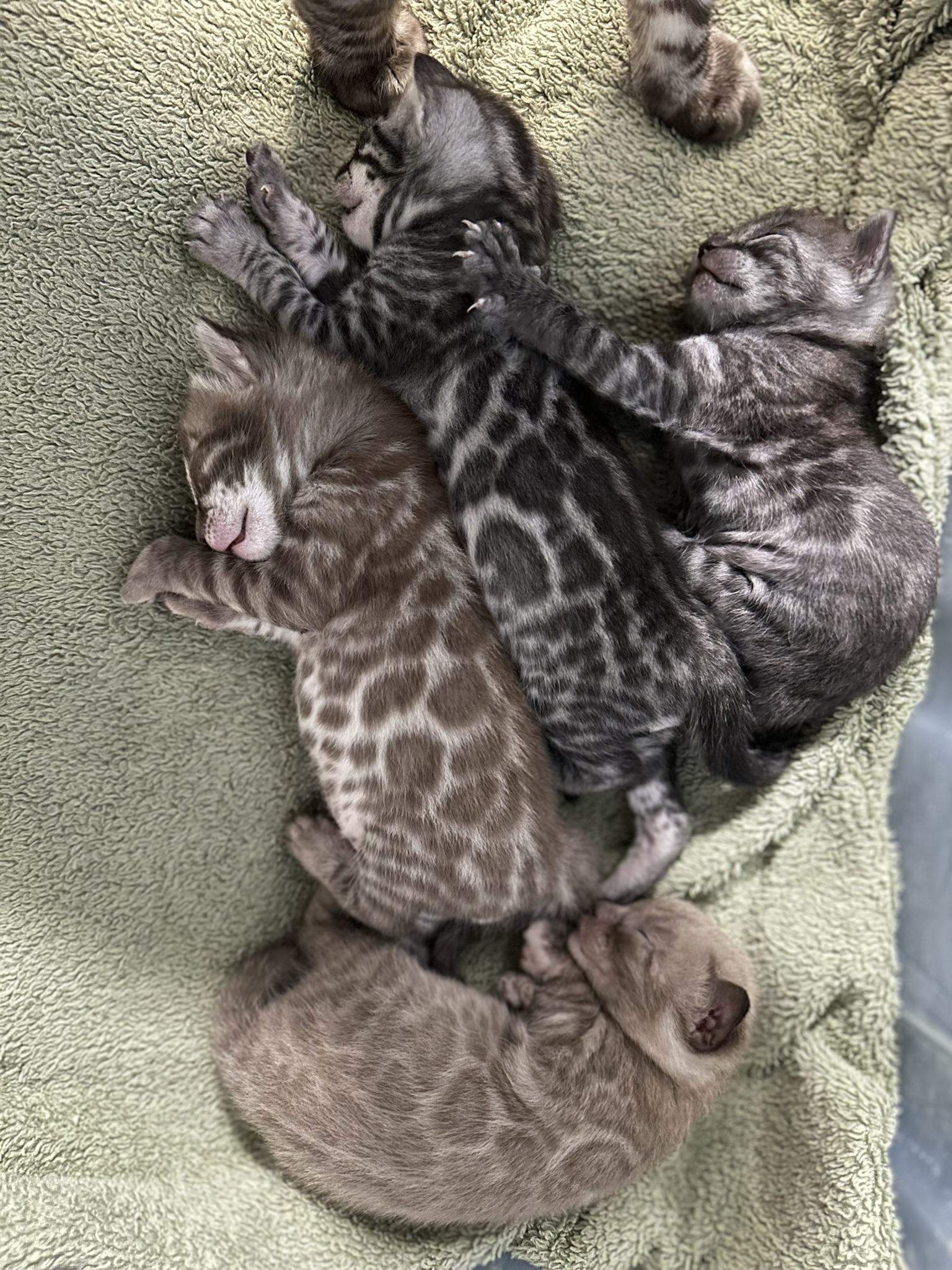 Leone and Bean have had one litter together with their second due Spring of 2026. Their first litter was a rainbow, pictured above a Charcoal Silver, Charcoal Sepia, Smoke and Smoke Mink!